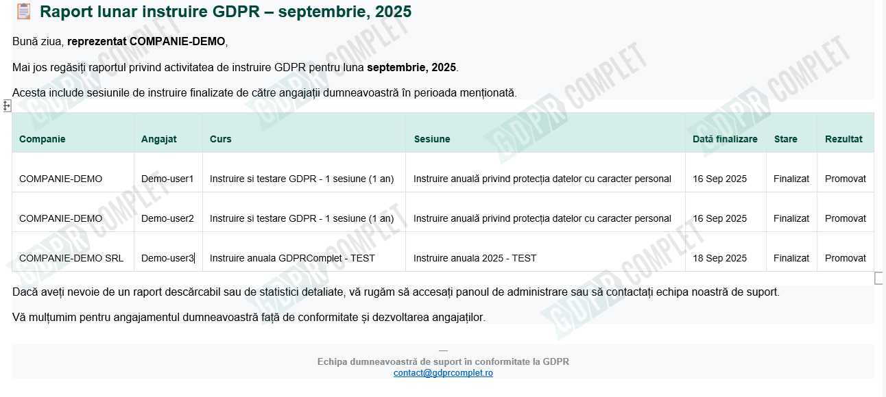 trimise la final de lună către persoana de contact a companiei și către echipa GDPR Complet.