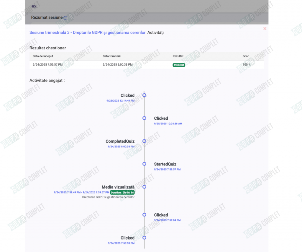 ce materiale a vizualizat, când a început și finalizat testul, scoruri obținute.