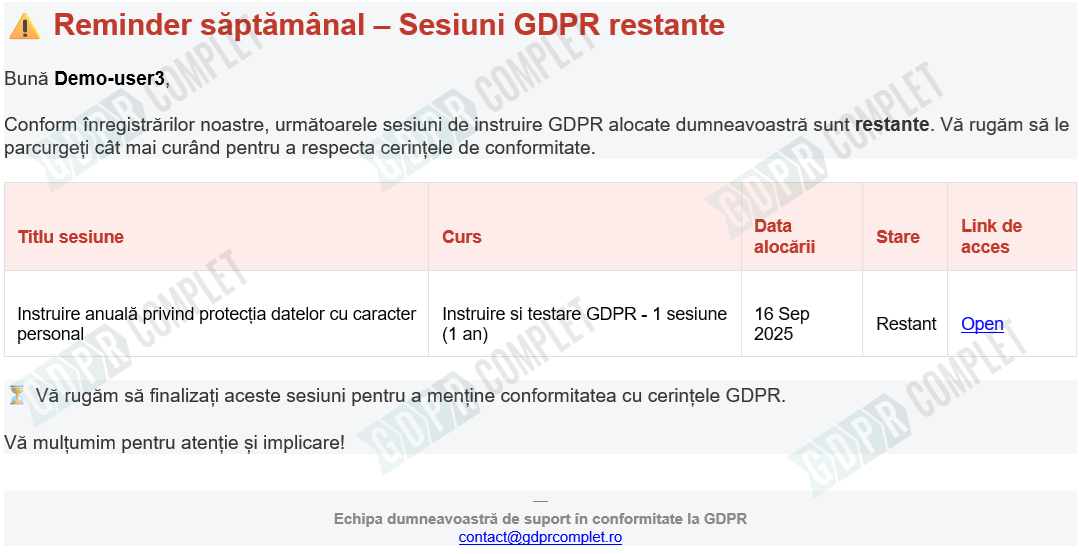 Reminder săptămânal pentru sesiuni restante – angajații primesc link direct de acces către sesiunea alocată.